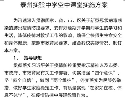 当前正处于新型冠状病毒感染的肺炎疫情防控的重要时期,泰州实验中学根据市局紧急会议精神,迅速部署相关工作,召开视频工作会议,成立疫情防控工作应急小组。在防控的同时积极做好延迟开学的教育教学工作,学校成立了名师空中课堂工作小组、“泰微课”学习应用指导小组,迅速开展了一系列工作。