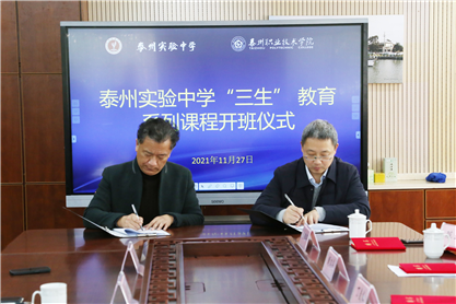 11月27日中午,泰州实验中学联合泰州职业技术学院举行“三生教育”课程实施开班仪式。泰州职业技术学院医学技术学院院长周涛,教科研办公室主任张星,学工办主任张丽,成教办公室副主任陈涓,护理系主任丁美红,泰州实验中学党委书记、校长卞玉年,副校长杨建忠、刘永华,安管处主任王洪华、年级主任黄忠玉及“三生教育”课程授课老师代表参加了开班仪式。仪式由刘永华主持。