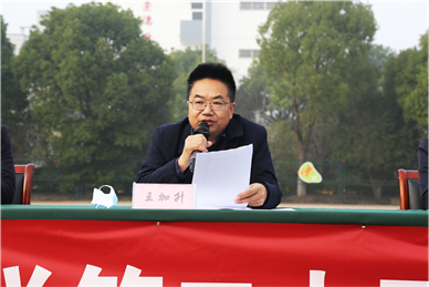 在全体师生奏唱庄严的国歌后,副校长王加升致开幕词。首先,他向全体师生说明了今年运动会因为疫情等多种因素延期举办的情况;然后,他肯定了运动会的筹备工作,强调了田径运动会对我校教育工作的重要意义,赞扬了我校同学在市直学校篮球比赛和四星级高中创建现场评估等活动中取得的成绩;最后,他预祝本届运动会取得圆满成功。
