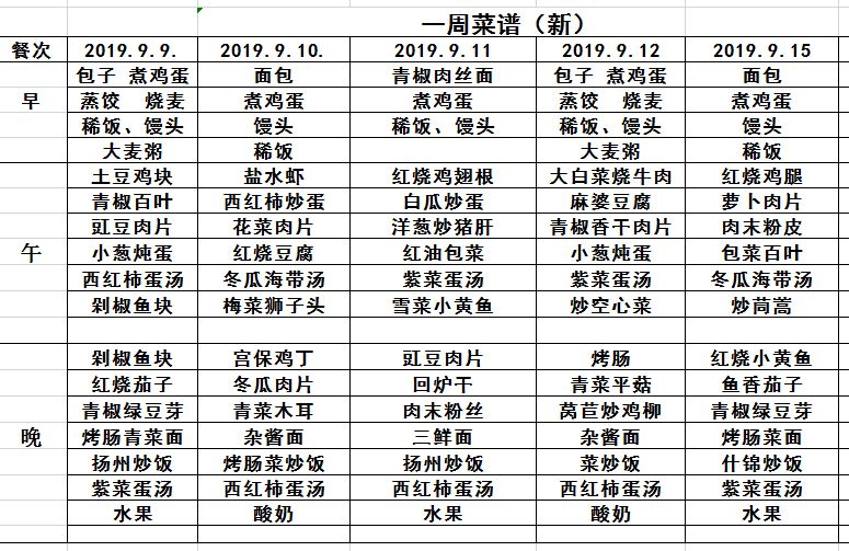 2019年秋学期第2周菜谱
